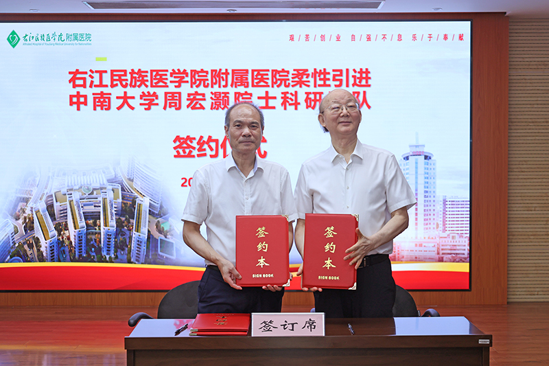 7月2日上午,右医附院(临床医学院)在总院区门诊六楼会议室隆重举行“柔性引进中南大学周宏灏院士科研团队”签约仪式。会上,李雪斌校长代表学校党政领导及全体师生员工向周宏灏院士带领专家科研团队的正式进驻学校和附属医院(临床医学院)表示热烈欢迎和致以崇高敬意。李雪斌校长强调,学校党委和各级部门将不遗余力、全力支持周宏灏院士科研团队在学校开展各项工作,在周宏灏院士科研团队强大的平台上,乘势起飞,以奋发有为、拼搏进取、敢为人先的意志,推动精准医学、遗传药理学和药物基因组学等系列科研项目在右医落地生根,打造出更多更优质科研成果并造福老区百姓,加快实现新时代区域性高水平医科大学的奋斗目标。