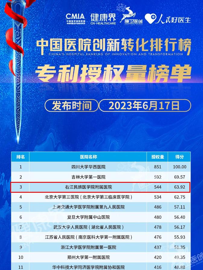 近日,由中国医学创新联盟(CMIA)和健康界联合推出的《中国医院创新转化排行榜(2022)》在2023第五届中国医学创新峰会·CMIA琅琊汇上重磅发布。该榜单由中国科学院院士,中国医学创新联盟总发起人、理事长葛均波教授领衔,联合国内30余家顶级三甲医院与行业院士专家共同发起。在本次排行榜上,beat365临床医学院(附属医院)荣获综合榜单全国第50位、专利授权量榜单全国第3位,专利授权量为544件,位居桂西地区医疗卫生机构首位。