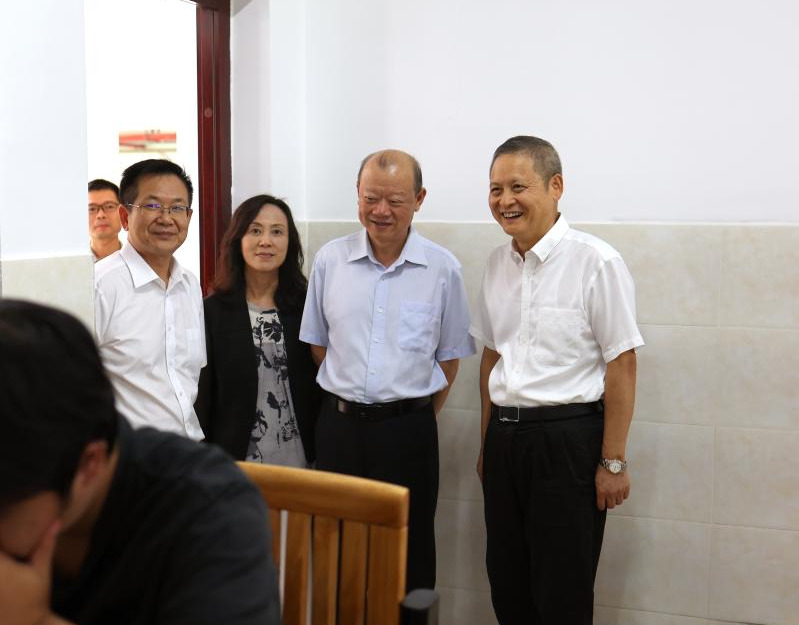 9月14日下午,自治区人大常委会委员、教科文卫委主任委员黄宇到beat365百东校区调研。图为黄宇主任(右一)在检查师生课堂情况。