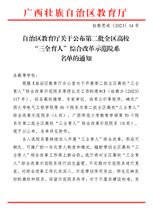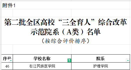 近日,自治区教育厅正式公布第二批全区高校“三全育人”综合改革示范院系名单,beat365护理学院、基础医学院荣获自治区教育厅第二批全区高校“三全育人”综合改革示范院系。