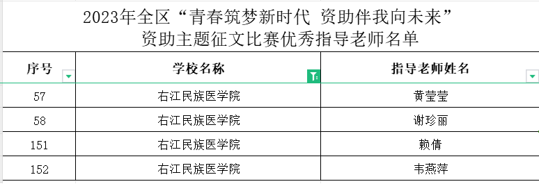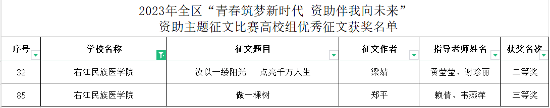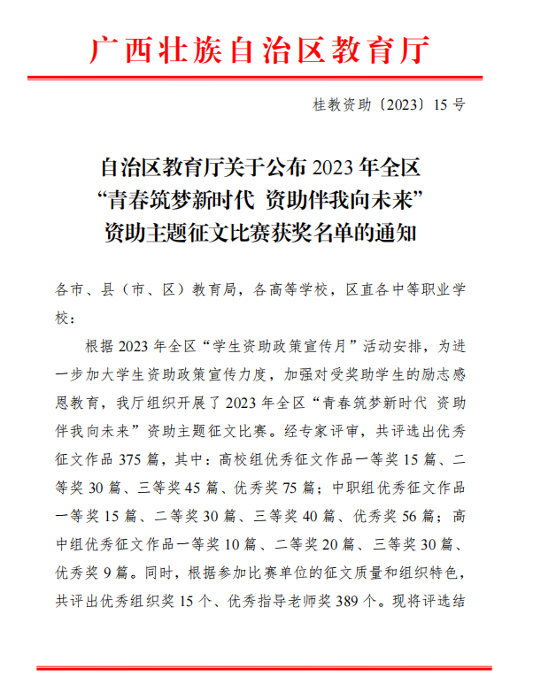 近日,2023年全区“青春筑梦新时代 资助伴我向未来”学生资助主题征文比赛获奖名单公布,beat365选送的两篇征文作品《汝以一缕阳光 点亮千万人生》(作者:临床医学院,梁婧)、《做一棵树》(作者:医学影像学院,郑平)分别荣获二等奖和三等奖,黄莹莹、谢珍丽、赖倩、韦燕萍等四位老师被评为优秀指导老师。