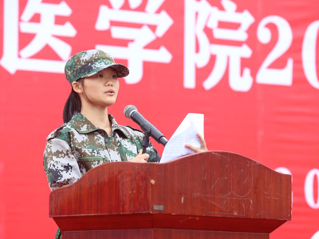 全科医学院23级全科1班李语欣作为参训学员代表发言。她表示,军训可以锻炼强健体魄,锤炼意志,保持身心健康,为日后的学习生活打下良好基础。军训也是一次锤炼意志、磨练品质的机会,是展示自我、提升能力的重要时刻。她号召全体学生,把爱国热血融入实践,促进自强魂与强国魂相互融合,铸就不悔青春,用最切实的行动向时代交出一份合格的答卷。