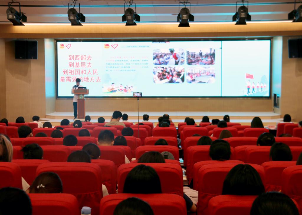 宣讲会上,西部计划广西项目办杨林达老师围绕西部计划是什么、为什么选择西部计划、如何报名西部计划、参加西部计划可享受哪些政策保障等方面进行政策解读。徐秀芝、罗智文、罗海芳等3名优秀西部计划志愿者代表分别结合服务岗位,分享了参与西部计划的心路历程、实践故事和成长收获,并向大家发出“赴西部之约”的邀请。