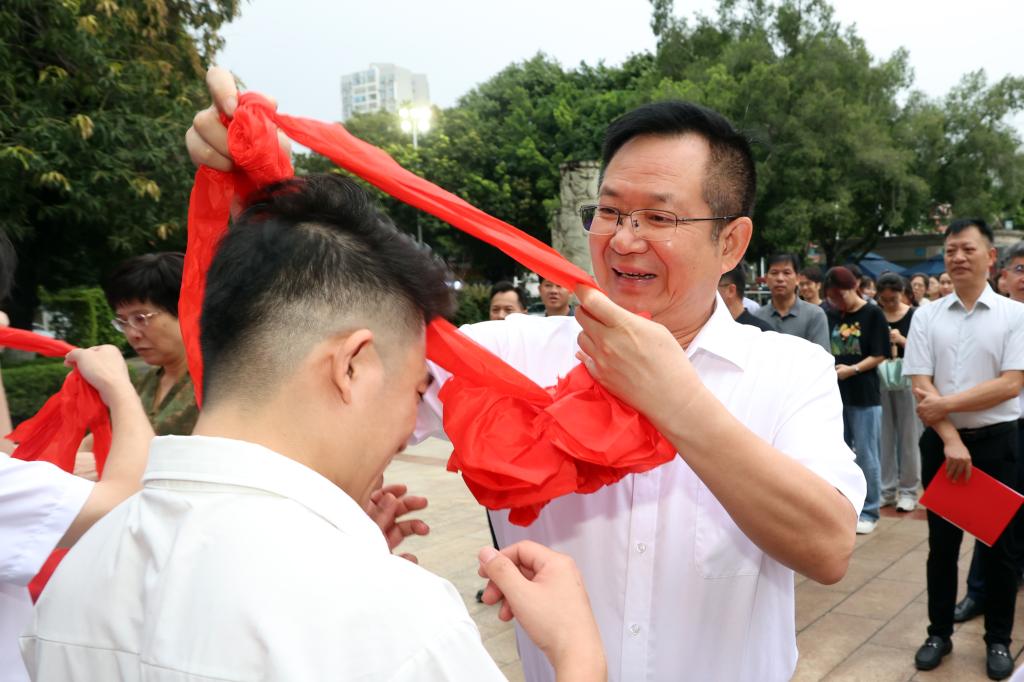 随后,全体校领导为新一轮驻村工作队队员佩戴大红花,表达对驻村干部的坚定支持。队员们精神抖擞,展现出昂扬的斗志和必胜的决心。