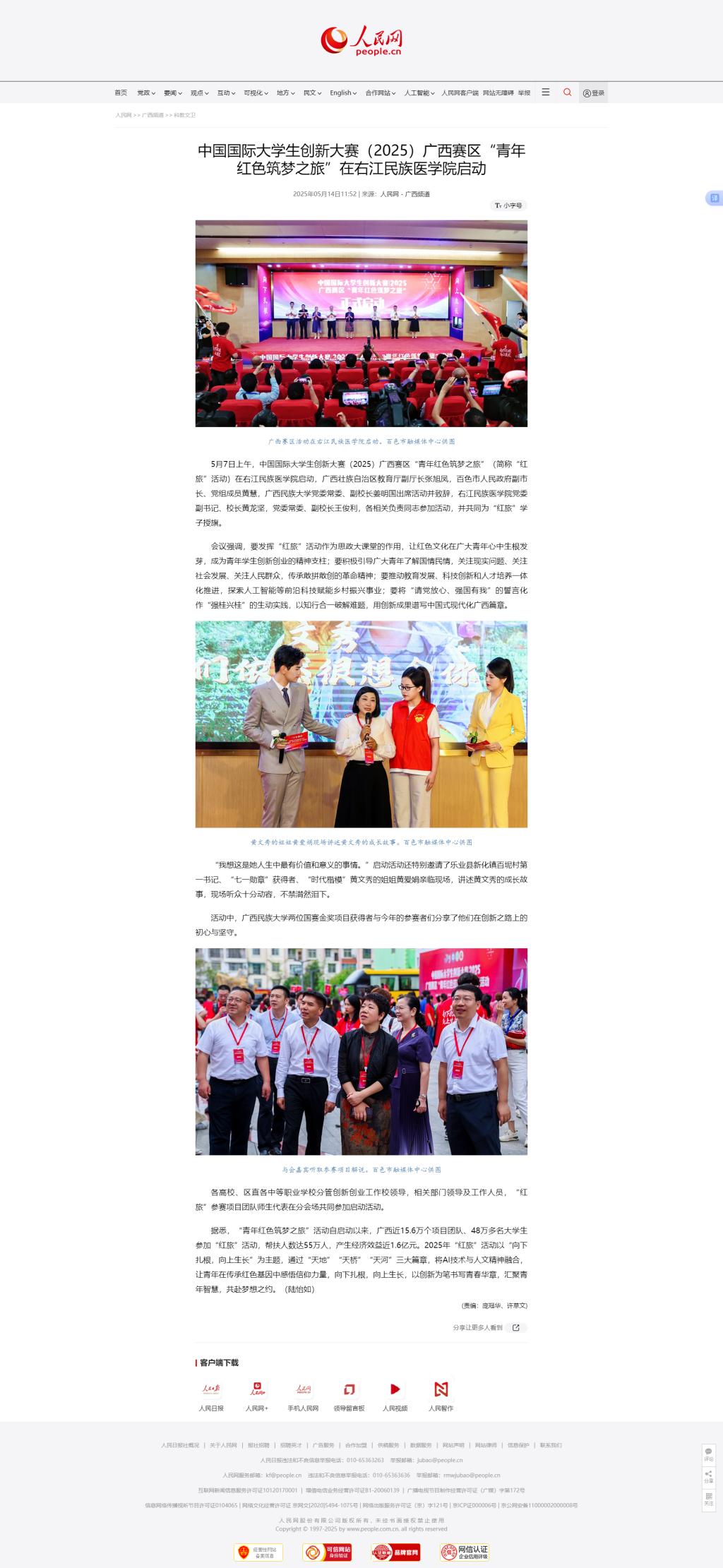 5月14日,人民网以《中国国际大学生创新大赛(2025)广西赛区“青年红色筑梦之旅”在beat365英国官方网站启动》为题,报道中国国际大学生创新大赛(2025)广西赛区“青年红色筑梦之旅”活动在beat365启动的盛况。