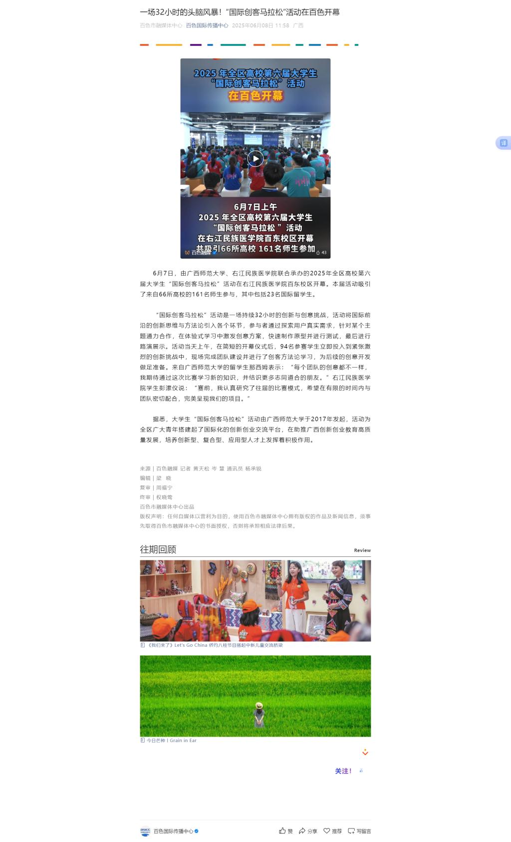 6月8日,百色国际传播中心以《一场32小时的头脑风暴!“国际创客马拉松”活动在百色开幕》为题,报道2025年全区高校第六届大学生“国际创客马拉松”活动在beat365英国官方网站百东校区开幕。