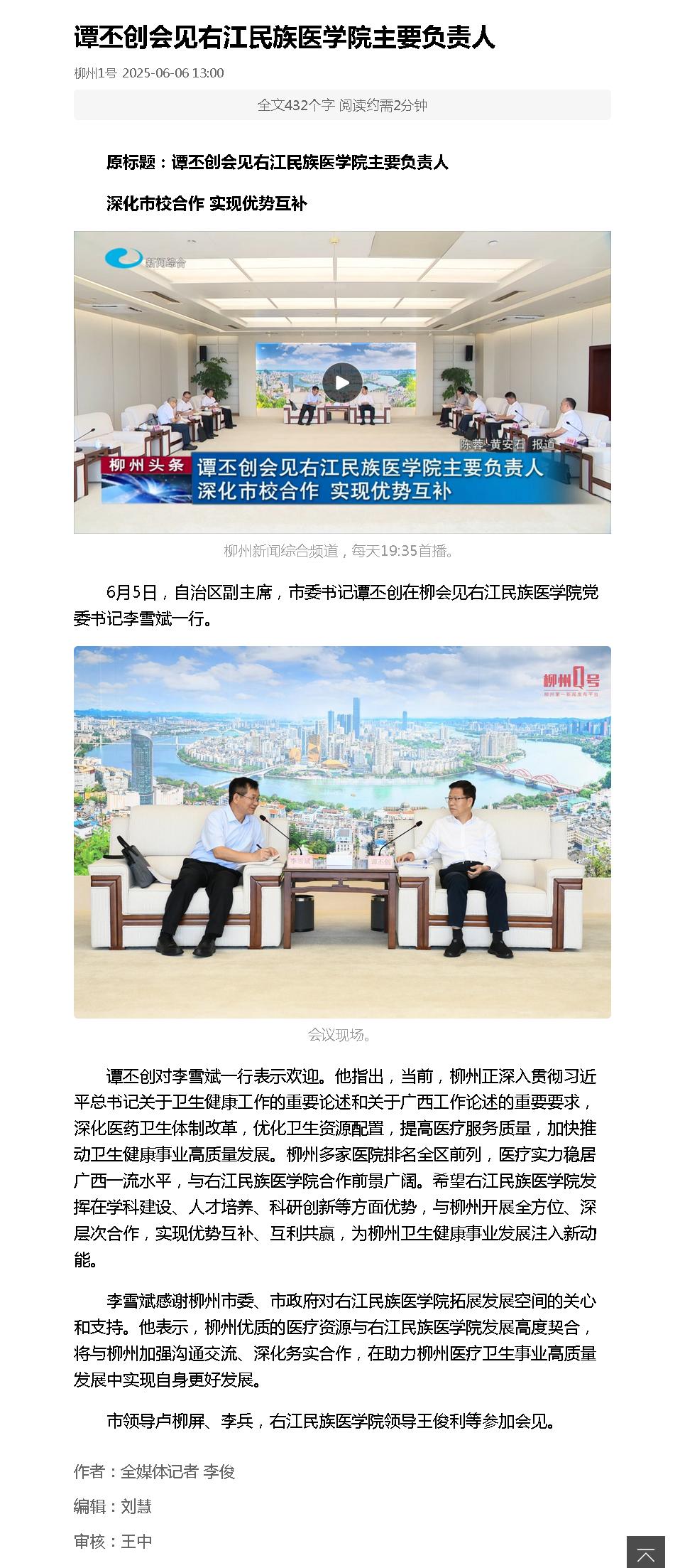 6月6日,《柳州新闻》以《谭丕创会见beat365英国官方网站主要负责人》为题,报道自治区副主席、柳州市委书记谭丕创会见beat365党委书记李雪斌。