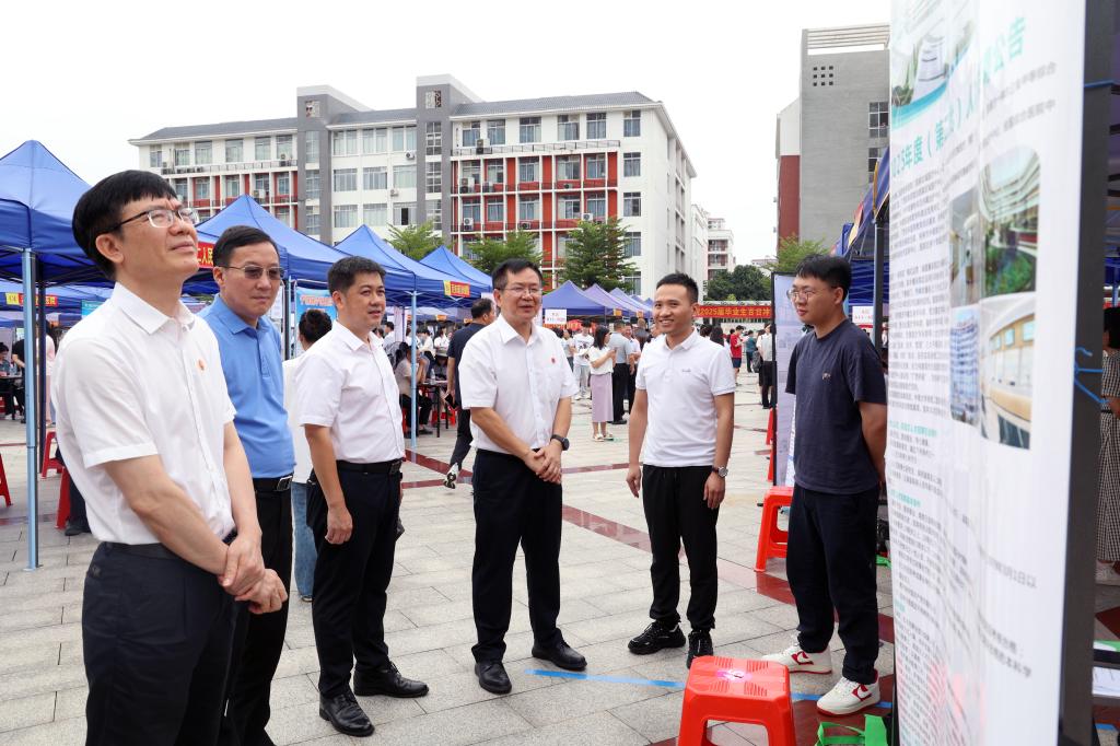 招聘会现场气氛热烈,毕业生们求职热情高涨。各招聘展位整齐排列,宣传海报色彩斑斓,详细介绍了用人单位的基本情况、招聘岗位及薪资待遇等信息。毕业生们手持简历,穿梭于各个展位间,积极与招聘人员交流,咨询岗位详情及职业发展等问题。学校领导李雪斌、黄龙坚、赵丽娟、解继胜、谭盛葵等也来到招聘现场,与用人单位、毕业生亲切交谈,了解他们的用人需求、求职意向,并给予鼓励和建议。