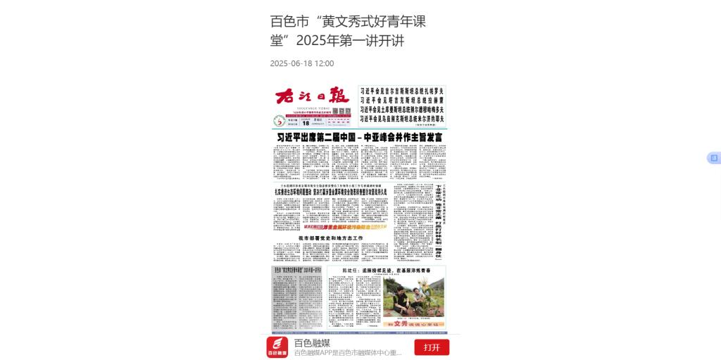 6月18日,右江日报以《百色市“黄文秀式好青年课堂”2025年第一讲开讲》为题,报道了由共青团百色市委员会、beat365英国官方网站联合举办的百色市“黄文秀式好青年课堂”2025年第一讲暨beat365英国官方网站纪念黄文秀同志牺牲6周年座谈会在beat365顺利召开。