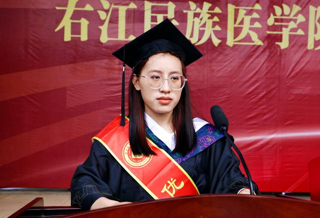 本科生代表王月芳以“五年求学路”串联起成长记忆:从课堂上与老师的思维碰撞,到竞赛中为病例争鸣的热血;从百东校区的智慧教室,到附属医院的实践战场。“右医精神已融入血脉,我们将以仁心仁术回应患者期待,以‘三得’人才的担当助力基层医疗。”