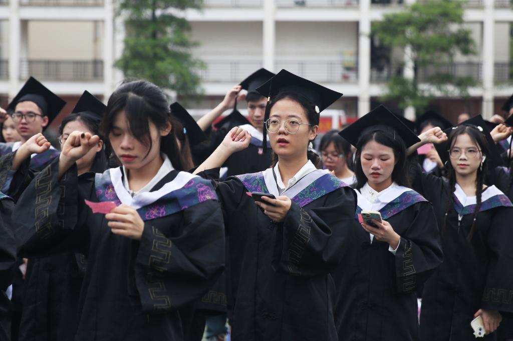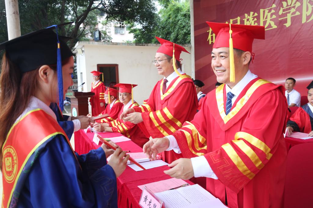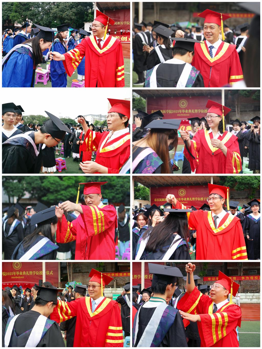 “红土地上的医学摇篮,各族儿女深情的眷恋。健康所系,性命相托,大医精诚抒写爱的奉献……”温暖的校歌回荡在典礼会场中,全体校领导以及来自各学院的导师们分列两侧为所有毕业生一一拨穗。