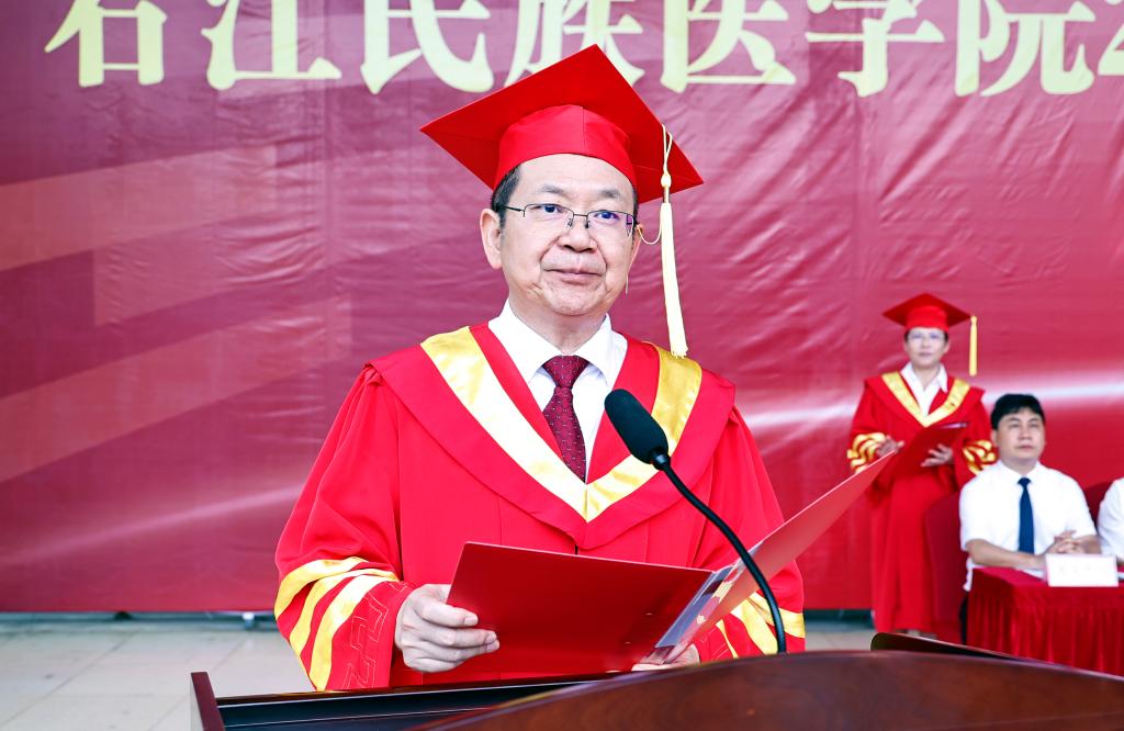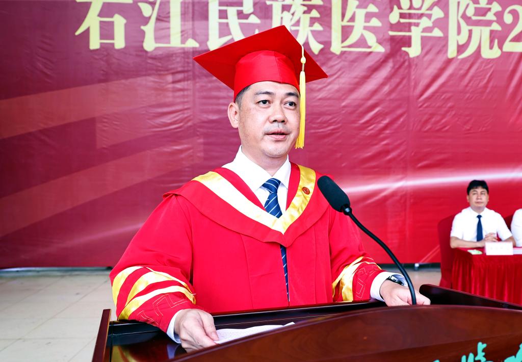 面对即将远行的学子,黄龙坚以“三愿”谆谆嘱托:一愿心怀“国之大者”,将人生坐标锚定民族复兴航程。健康中国需要你们在基层医疗一线扎根,科技强国期待你们在科研“无人区”探索。他以黄文秀为例,勉励学子到祖国最需要处发光发热,让青春脚步与家国脉搏同频共振。二愿永葆“敬畏之心”,以仁心仁术践行大医精诚。他特别提及捐献造血干细胞的周小艺、李浩等同学,强调医学不仅是技术,更是“视人病如己病”的共情力。技术是利刃,仁心是方向标,唯二者兼具方为良医。三愿恪守“诚于人品”,以纪律规矩校准人生航向。“纪律是护身符而非紧箍咒”,校长引康德名言警示学子:无论何时何地,需保持“头顶星空、心中道德”的清醒,在纷繁世界中坚守医德医风。