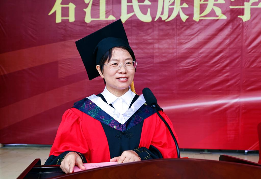 教师代表张莉芳以“下得去、用得上、留得住”九字箴言,道出母校对学子的期许。她回忆毕业生在实验室通宵攻关、在社区义诊奔波的身影,动情说道:“你们用担当扛起求索重任,用实干丈量成长维度,这份精神将照亮更多后来者的路。”