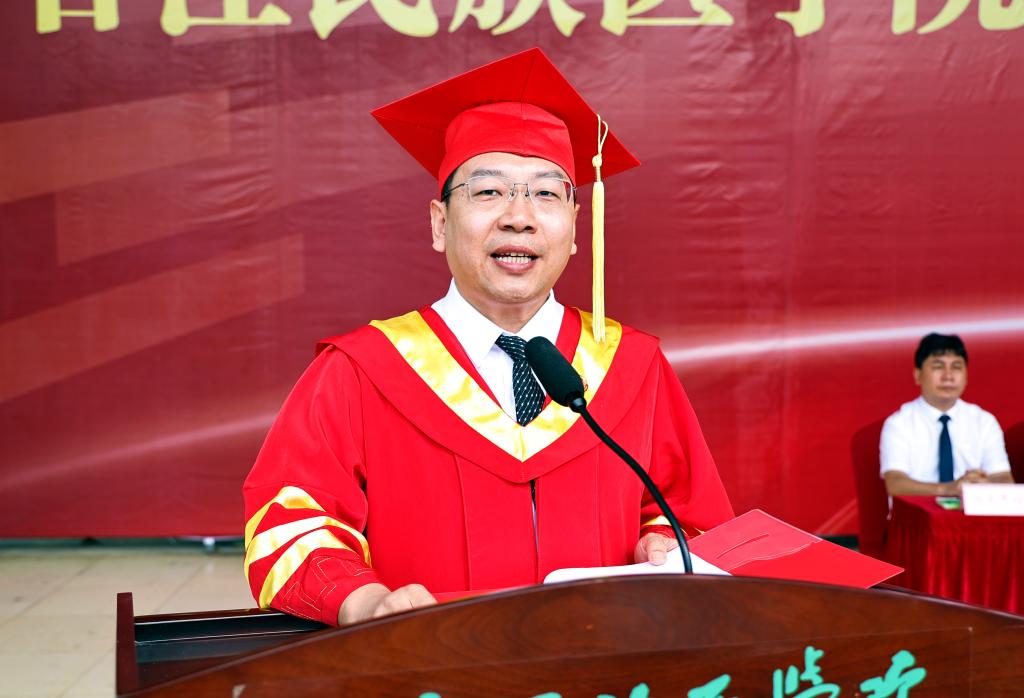 “你们是学校高质量发展的参与者,更是民族复兴的见证者。”黄龙坚校长在讲话中深情回顾毕业生与学校共成长的轨迹:从抗击新冠疫情到见证学校获博士学位授予单位立项,从百东新校区启用到国家级教学成果奖突破,右医人用奋斗书写着新时代的答卷。
