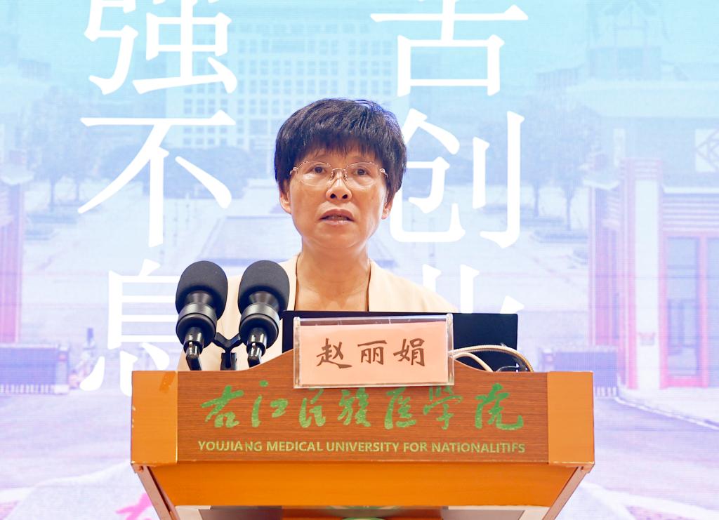 赵丽娟在讲话中指出,多年来,学校形成了“三突出三促进”社会实践模式,“三下乡”队伍足迹遍布乡村城镇,用实际行动诠释了新时代右医青年的责任与担当。她强调,要以学铸魂,在躬身实践中坚定理想信念,厚植家国情怀;要以行促学,在基层熔炉中锤炼过硬本领,勇于创新突破;要以责立身,在服务奉献中展现青年担当,绽放青春光彩;要以防为先,在未雨绸缪中筑牢安全基石,护航青春远行,要把个人的理想追求融入国家发展大局,在推进民族复兴伟业的征程中交出无愧于时代的青春答卷。