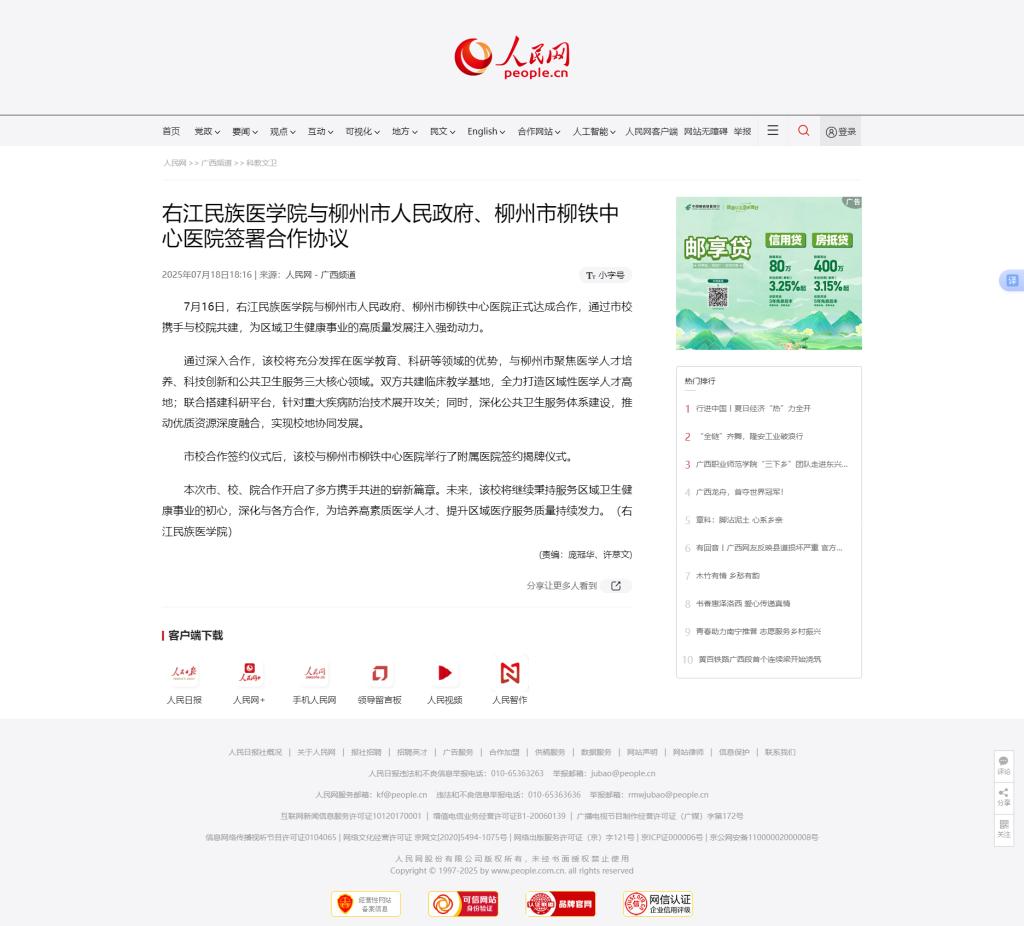 7月18日,人民网以《beat365英国官方网站与柳州市人民政府、柳州市柳铁中心医院签署合作协议》为题,报道了beat365英国官方网站与柳州市人民政府、柳州市柳铁中心医院正式达成合作,通过市校携手与校院共建,为区域卫生健康事业的高质量发展注入强劲动力。