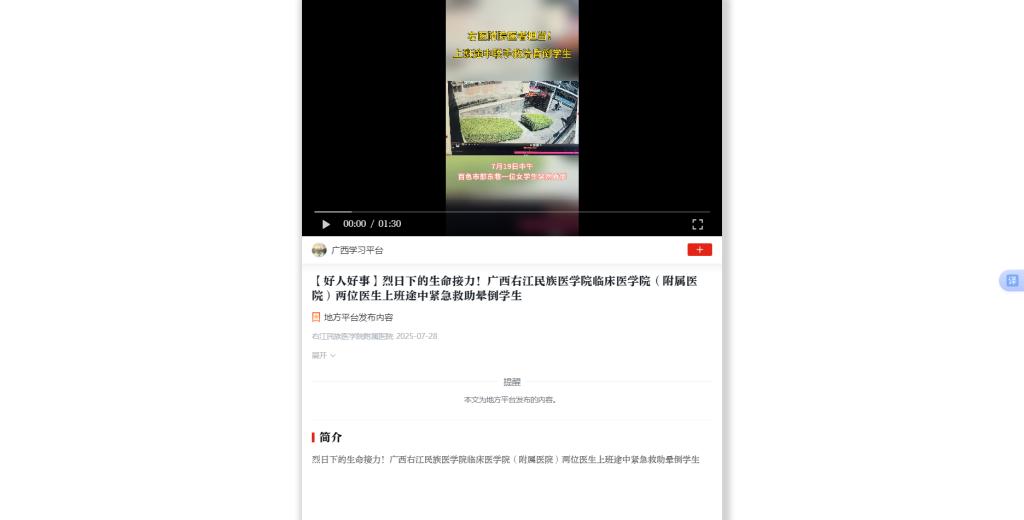 7月28日,“学习强国”平台以《【好人好事】烈日下的生命接力!广西beat365英国官方网站临床医学院(附属医院)两位医生上班途中紧急救助晕倒学生》为题,报道了beat365附属医院两位医生救助学生事件。