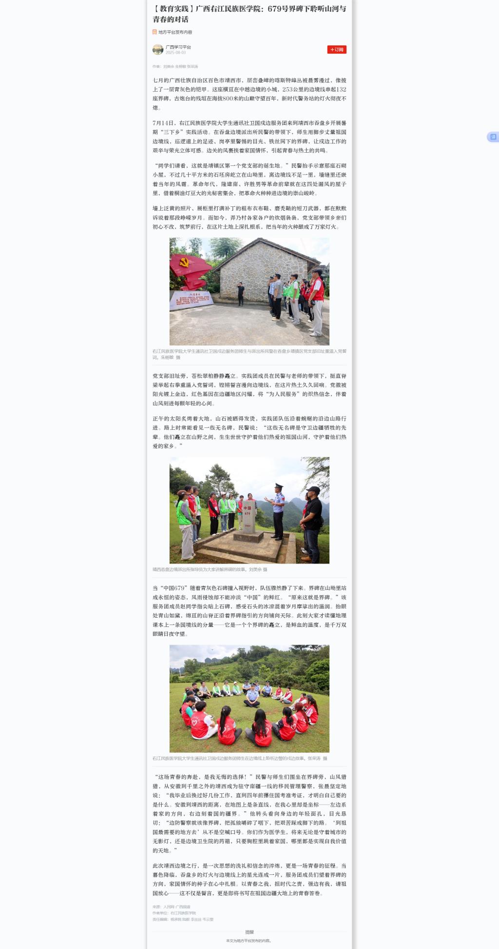 8月3日,学习强国以《广西beat365英国官方网站:679号界碑下聆听山河与青春的对话》为题,报道了beat365英国官方网站大学生通讯社卫国戍边服务团来到靖西市吞盘乡开展暑期“三下乡”实践活动。在吞盘边境派出所民警的带领下,师生用脚步丈量祖国边境线,边关的风裹挟着家国情怀,引起青春与热土的共鸣。