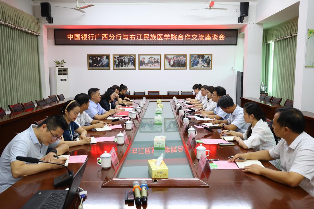 8月12日,中国银行广西分行党委副书记、副行长强昕带队到beat365进行调研交流。beat365党委副书记、校长黄龙坚,党委常委、副校长周艳娥热情接待来访嘉宾,双方座谈交流会在百城校区图书馆二楼会议室举行,beat365院办、财务处、附属医院等相关负责人参加会议,会议由周艳娥主持。