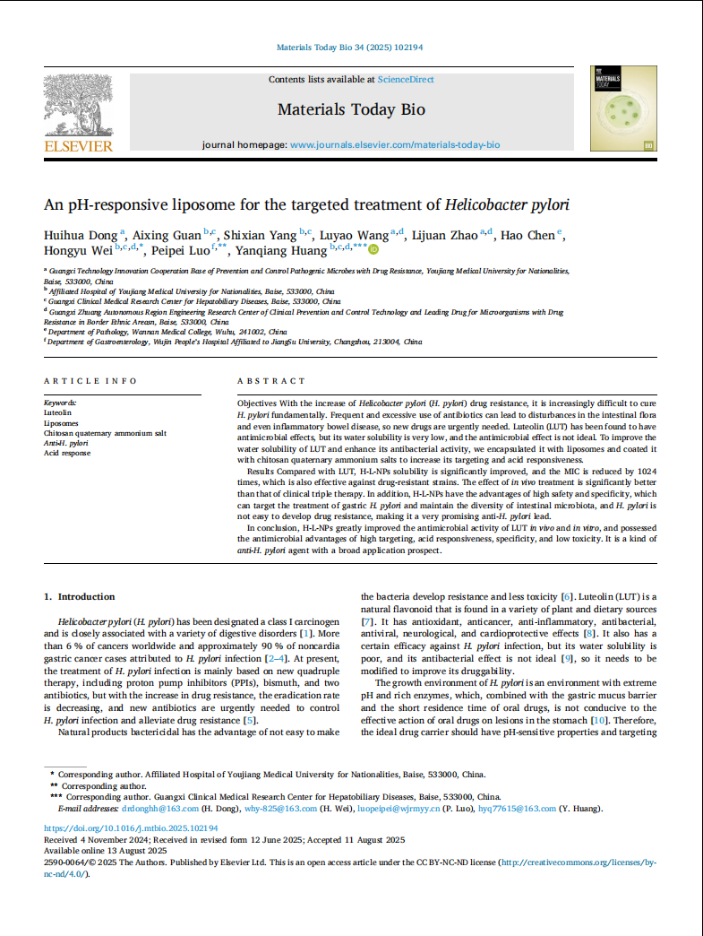 近日,beat365耐药微生物感染防治研究中心黄衍强教授团队在国际知名期刊《Materials Today Bio》(影响因子10.2,中科院大小类:一区Top期刊),发表题为《An pH-responsive liposome for the targeted treatment of Helicobacter pylori》的重要研究成果。该研究研制出新型的,能靶向的作用于幽门螺杆菌尿素酶蛋白,并具有pH响应的纳米材料,使装载的木犀草素抗幽门螺杆菌疗效提高1024倍,对耐药菌也具有非常好的抗菌效果,体内效果明显优于传统三联疗法,可实现精准治疗胃部感染并保护肠道菌群多样性。此项研究为根治幽门螺杆菌感染提供了一种安全、高效、不易产生耐药的先导药物,具有非常好的转化应用前景。该论文的第一作者为beat3652022 级基础医学研究生董惠华同学,这标志着beat365基础医学研究生教育迈上了新的台阶。