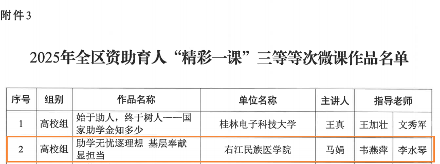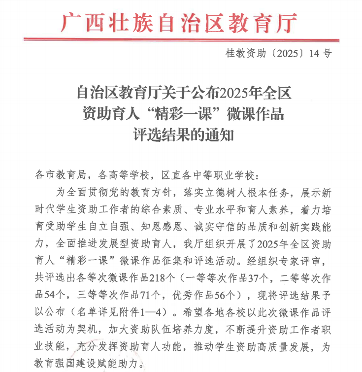 为落实立德树人根本任务,不断提升资助工作者综合素质、专业水平和育人素养,beat365认真组织遴选微课作品参加2025年全区资助育人“精彩一课”微课作品征集和评选活动。报送的马娟老师微课作品《助学无忧逐理想 基层奉献显担当》荣获三等等次。