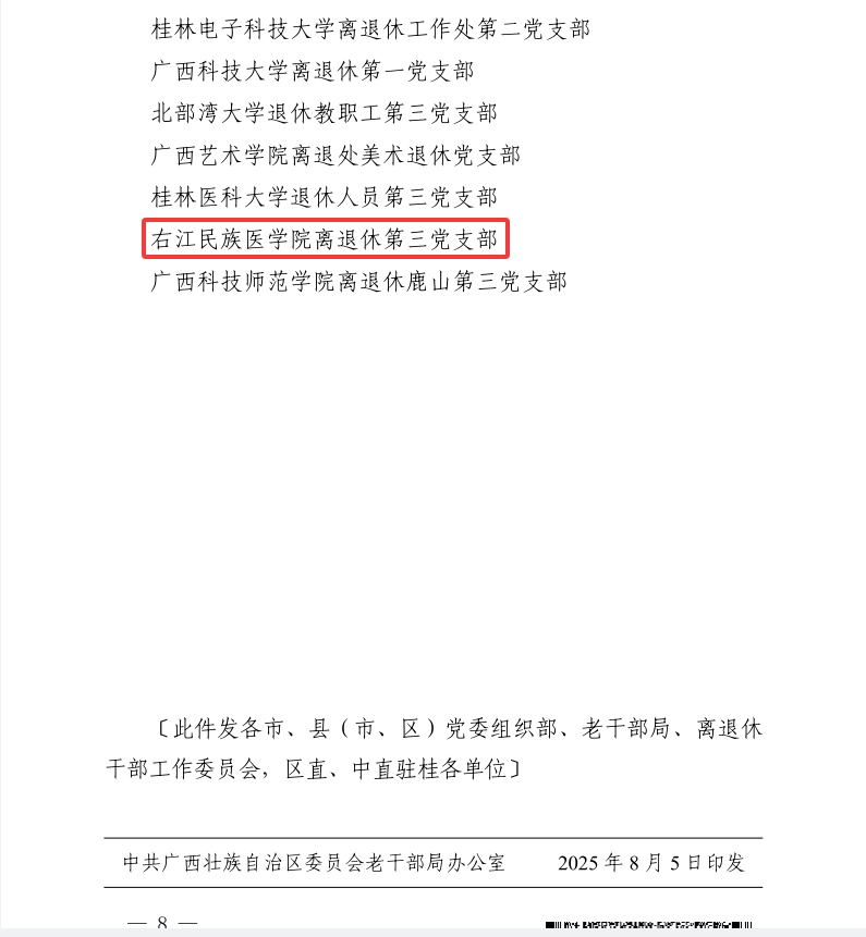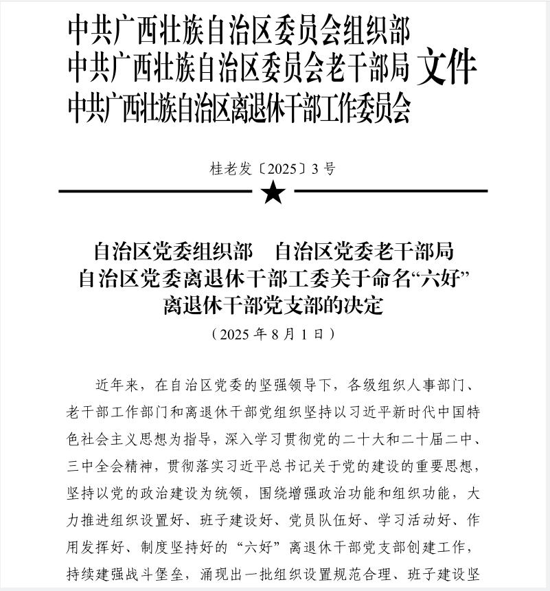 近日,根据《自治区党委组织部 自治区党委老干部局 自治区党委离退休干部工委关于命名“六好”离退休干部党支部的决定》(桂老发〔2025〕3 号),beat365英国官方网站离退休第三党支部被授予“六好”离退休干部党支部荣誉称号。此次全区共评选出100个“六好”离退休干部党支部,仅9所高校获此殊荣,我校党支部的入选,既是自治区党委相关部门对学校基层党建工作的高度认可,也充分展现了我校在离退休党建工作中的扎实基础与优良成效。