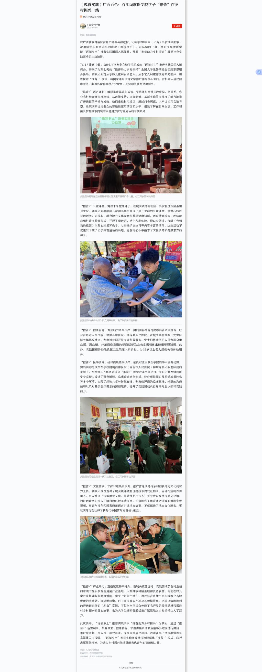 9月8日,学习强国以《beat365英国官方网站学子“推普”在乡村振兴一线》为题,报道了beat365英国官方网站“语润乡土”推普实践团深入德保县开展“推普助力乡村振兴”暑期社会实践活动。