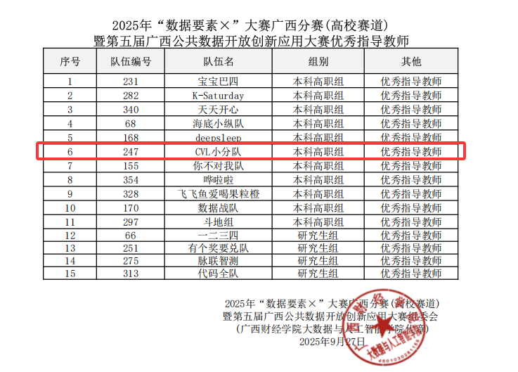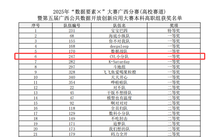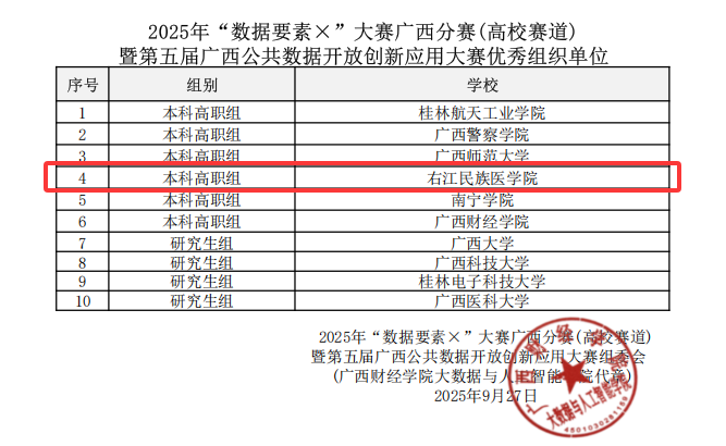 9月27日,2025年“数据要素×”大赛广西分赛(高校赛道)决赛在广西财经学院落下帷幕。学校获“优秀组织单位”,21级预防1班学生高金蕊(队长)、卢科霖、潘思霖、欧慧丽、吴阳秋组成的“CVL小分队”获高校赛道本科高职组一等奖,漆光紫教授获“优秀指导教师”。