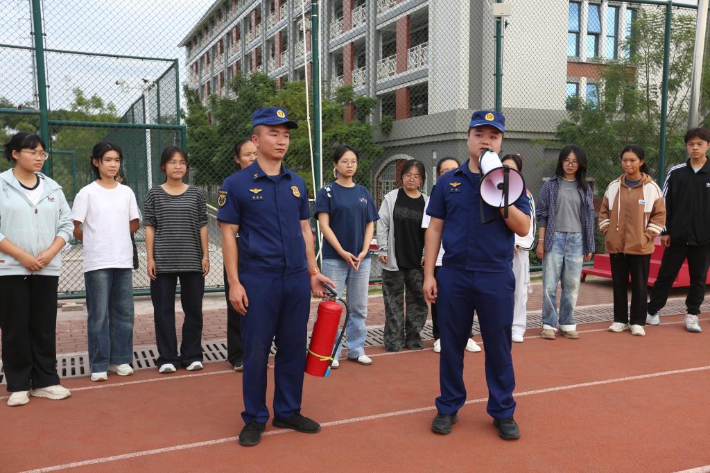 疏散完成后,消防救援大队教官现场讲解消防安全知识,结合典型火灾案例,剖析校园火灾隐患,强调日常用电、用火等安全注意事项。在灭火器实操环节,教官示范“提、拔、握、压”标准动作后,反复强调“对准火焰根部喷射”的关键技巧。随后,师生代表依次上前体验,亲手操作灭火器扑灭模拟火点,从“看理论”到“练实操”,直观掌握灭火技能,现场响起阵阵掌声。