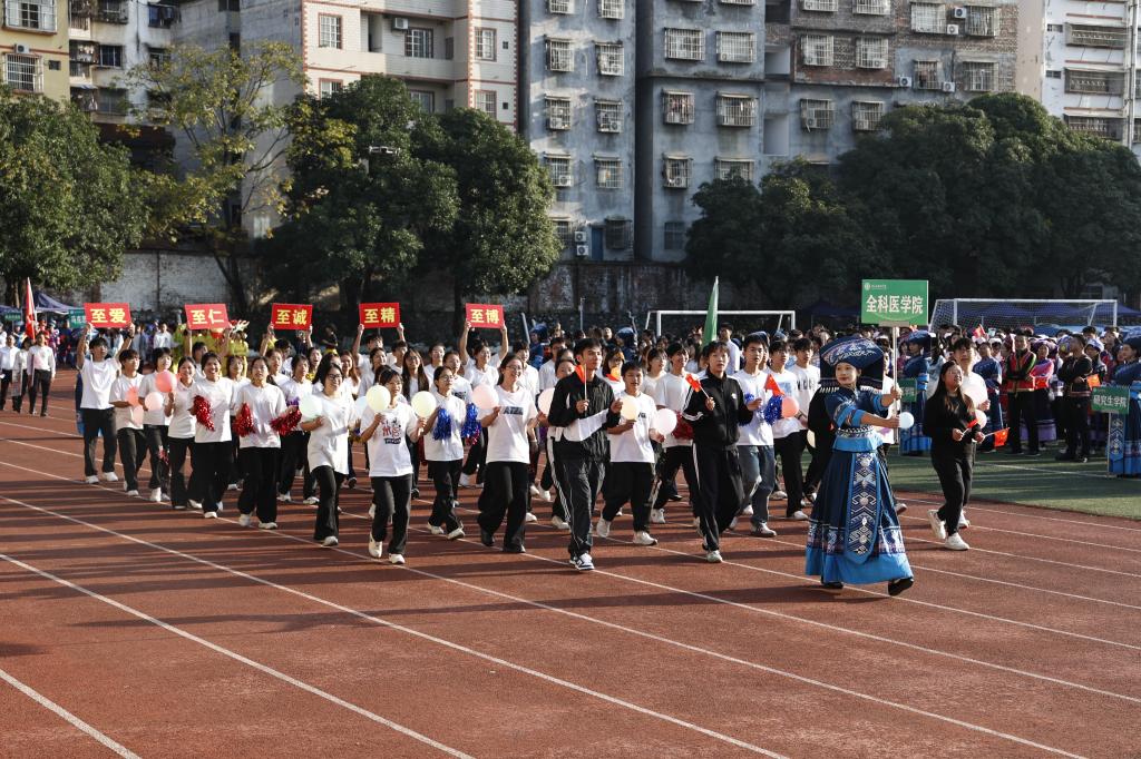 在开幕式上,学校党委书记李雪斌致开幕词。他首先代表学校党政领导和运动会组委会,对本次运动会的顺利召开表示祝贺,向为筹备组织这次运动会的全体工作人员和积极备战的全体参赛运动员表达感谢与问候。他指出,青春因运动而更加绚丽多彩,人生因奋斗而更加厚重辽阔,beat365在体育工作取得的优异成绩,充分展现了右医学子昂扬向上、追求卓越的奋斗姿态,也生动诠释了“艰苦创业、自强不息”的右医精神。同时,李雪斌书记对同学们提出了三点希望:一是在运动场这个淬炼“钢筋铁骨”的最佳熔炉中为人生积蓄能量;二是将体育精神作为塑造“卓越品格”的“磨刀石”,为职业生涯锻造坚韧内核;三是将团队协作为凝聚“磅礴力量”的核心引擎,在运动场上体会“我们”大于“我”的真谛。