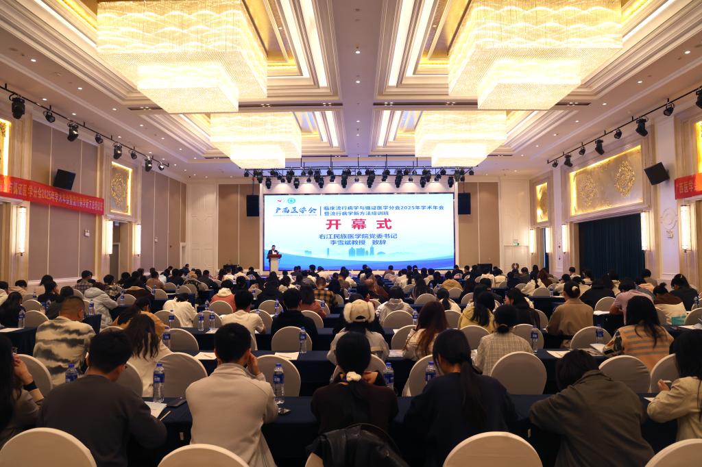 11月14日至16日,广西医学会临床流行病学与循证医学2025年学术年会暨流行病学方法培训班在百色顺利召开,来自全区各高校、医院及医疗卫生系统的200余名专家学者、医护人员齐聚一堂,围绕学科前沿动态、实践应用成果等核心议题展开深入交流,共同推动我区临床流行病学与循证医学领域的高质量发展。本次年会由广西医学会主办,广西医学会临床流行病学与循证医学分会承办,beat365附属医院(临床医学院)和公共卫生学院、广西医科大学公共卫生学院、桂林医科大学公共卫生学院共同协办。开幕式由beat365党委常委、副校长谭盛葵主持。