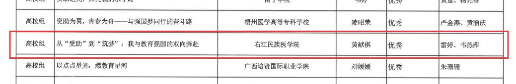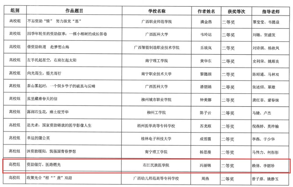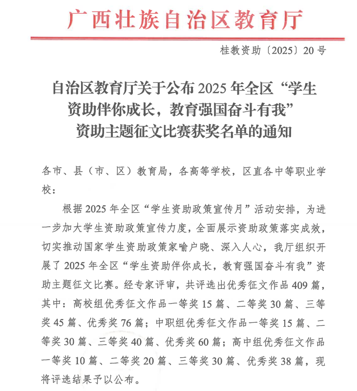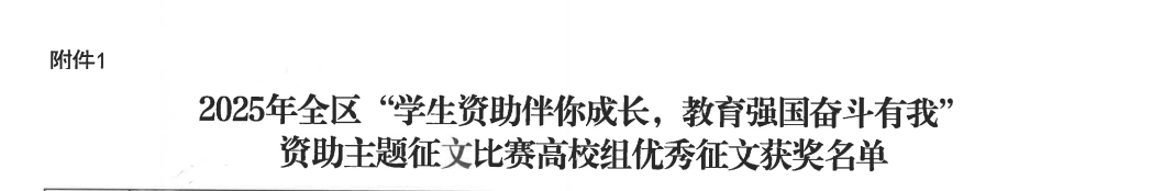 近日,自治区教育厅正式公布2025年全区“学生资助伴你成长,教育强国奋斗有我”主题征文比赛获奖名单,beat365学子以真挚笔触书写资助政策帮扶下的成长故事,beat365报送的作品《资助做灯,一路燃光》《从“受助”到“筑梦”:我与教育强国的双向奔赴》分别荣获高校组二等奖、优秀奖。