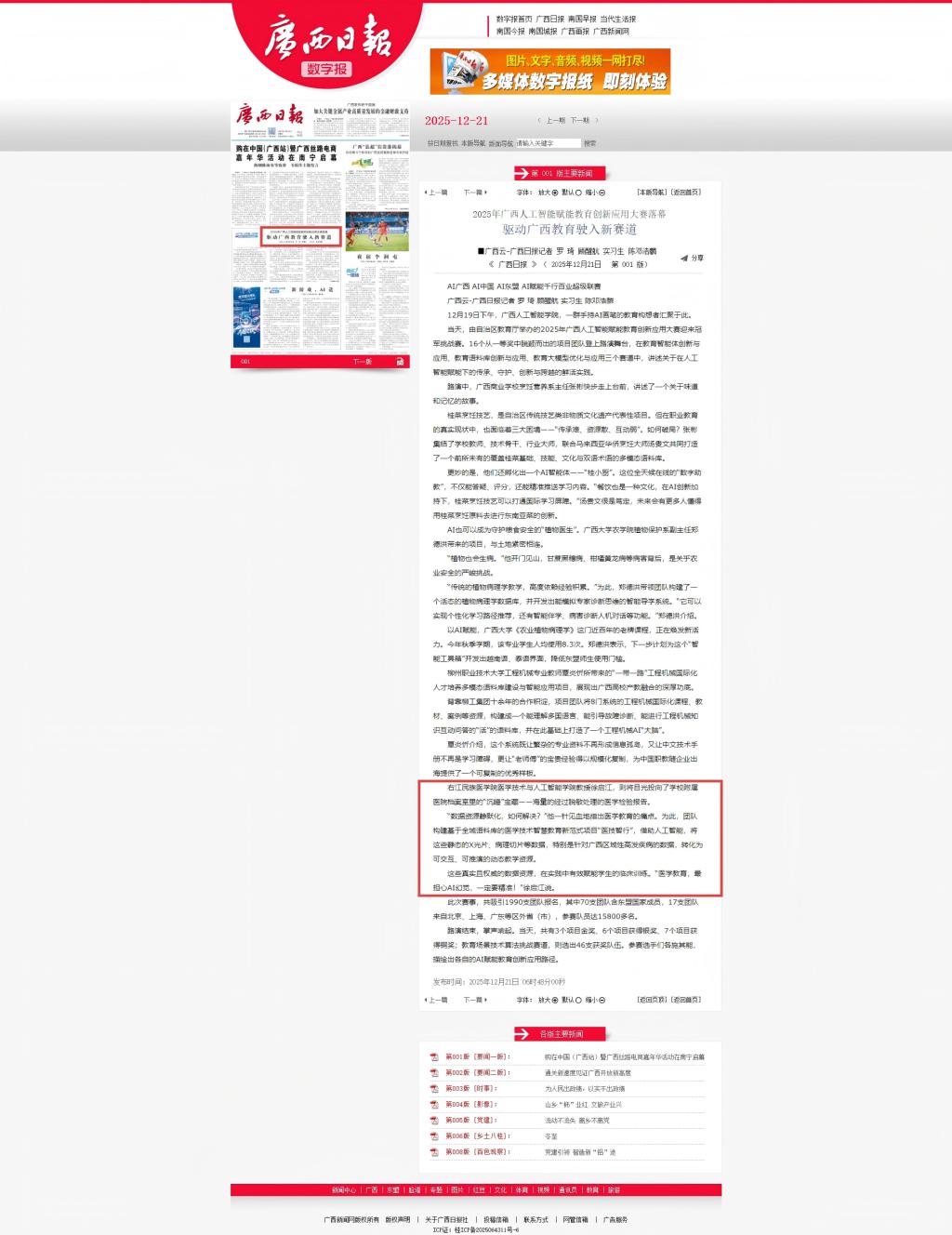 近日,央广网、广西电视台、广西日报、八桂教育等多家媒体报道2025年广西人工智能赋能教育创新应用大赛在广西人工智能学院落幕。其中,beat365徐启江教授“医检灵境·芯语智教”团队的创新项目“医技智行:构建基于全域语料库的医学技术智慧教育新范式”获金奖。徐启江教授在接受采访时表示,希望借助人工智能来赋能学生的临床思维能力。