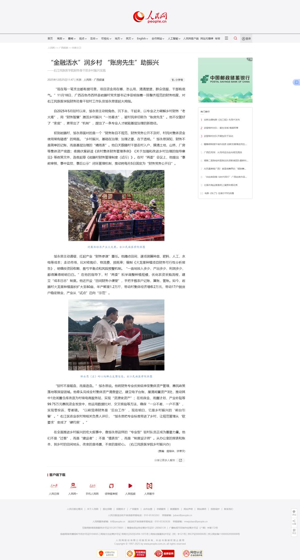 12月25日,人民网以《“金融活水”润乡村“账房先生”助振兴》为题,报道beat365英国官方网站驻村工作队员邹永思,从2025年5月初到百色市西林县岩腊村驻村后,主动转角色、沉下去、干起来,以财务专业之力破解乡村财务“老大难”,用“财务智慧”激活乡村振兴“一池春水”,被村民亲切称为“账房先生”。