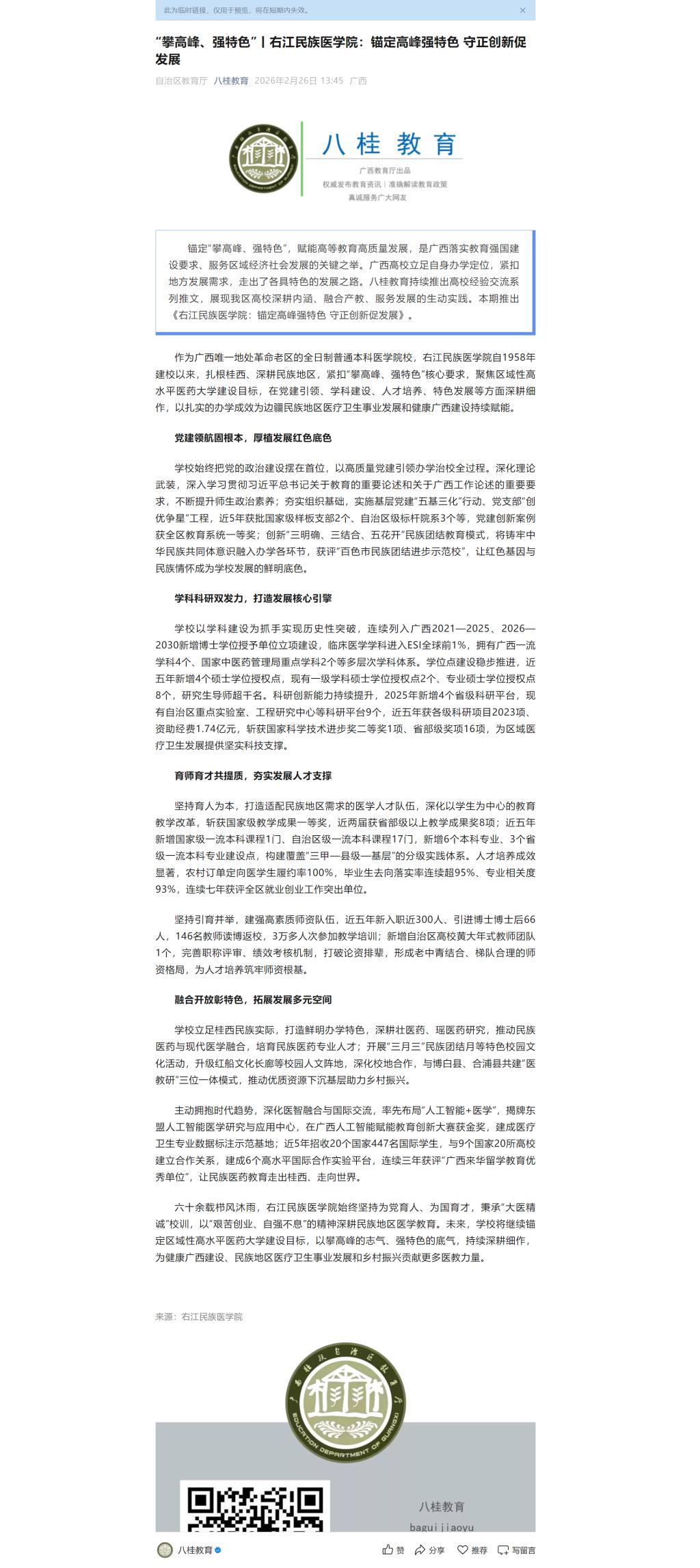 2月26日,八桂教育以《“攀高峰、强特色”丨beat365英国官方网站:锚定高峰强特色 守正创新促发展》为题,介绍beat365扎根桂西、深耕民族地区,紧扣“攀高峰、强特色”核心要求,聚焦区域性高水平医药大学建设目标,在党建引领、学科建设、人才培养、特色发展等方面深耕细作,以扎实的办学成效为边疆民族地区医疗卫生事业发展和健康广西建设持续赋能。