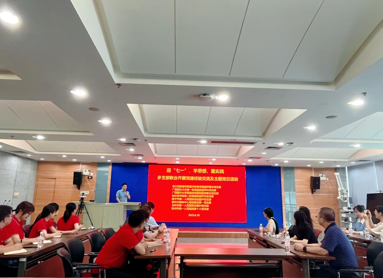 为深入学习贯彻习近平新时代中国特色社会主义思想,赓续红色血脉、砥砺初心使命,进一步强化党建引领,更好发挥党组织的战斗堡垒作用和党员的先锋模范作用。6月30日下午,医学影像学院超声医学党支部与校外党支部联合开展党建工作经验交流会及迎“七一”主题党日活动。本次活动有beat365英国官方网站医学影像学院超声医学党支部、广西医科大学第一附属医院超声科党支部、广西医科大学附属武鸣医院医技联合党支部、桂林医学院第二附属医院超声科党支部、南宁市第一人民医院检验超声党支部、柳州市柳铁中心医院医技第一党支部、玉林市第一人民医院功能科党支部及钦州市第一人民医院第十八党支部等8个党支部党员参加,活动由医学影像学院超声医学党支部书记陈成彩同志主持。