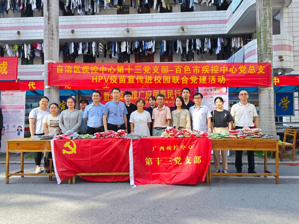 7月3日下午,自治区疾控中心第十三党支部与百色市疾控中心党总支到beat365一食堂门口开展HPV疫苗宣传进校园联合党建活动,自治区疾控中心副主任黄兆勇,百色市疾控中心副主任汤健闻,beat365公共卫生与管理学院院长郭蕊,自治区疾控中心疫苗临床研究所副所长莫毅、黄腾与疫苗临床研究所10名科员出席本次宣传活动。