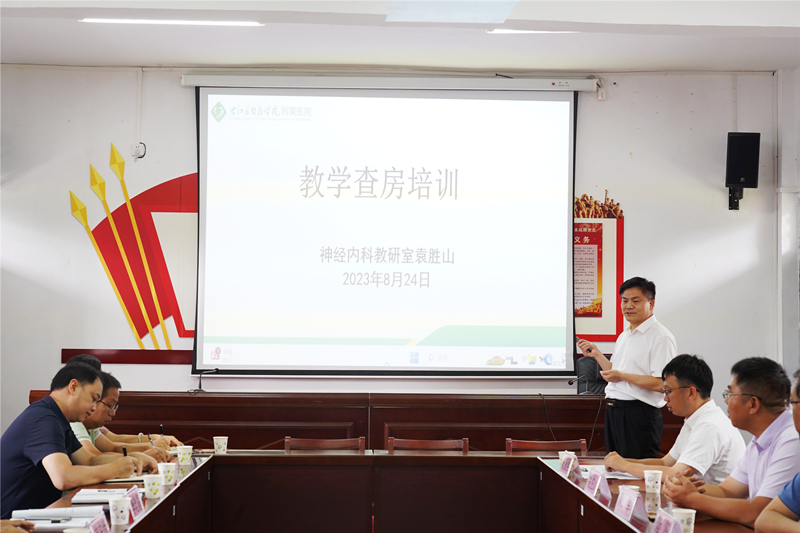 最后,右医附院神经内科专业基地梁雄壮副教授讲述了精神心理方面的教学问题,就如何开展理论课程教学进行指导,分享教学经验;右医附院教学部古贤君副部长强调了本科教育教学工作的具体要求和教学情况;右医附院毕业后继续教育管理科副科长邓军教授宣讲右医附院住培十年周宣传月系列活动的住培政策;右医附院神经内科专业基地袁胜山副教授进行了住培师资培训。