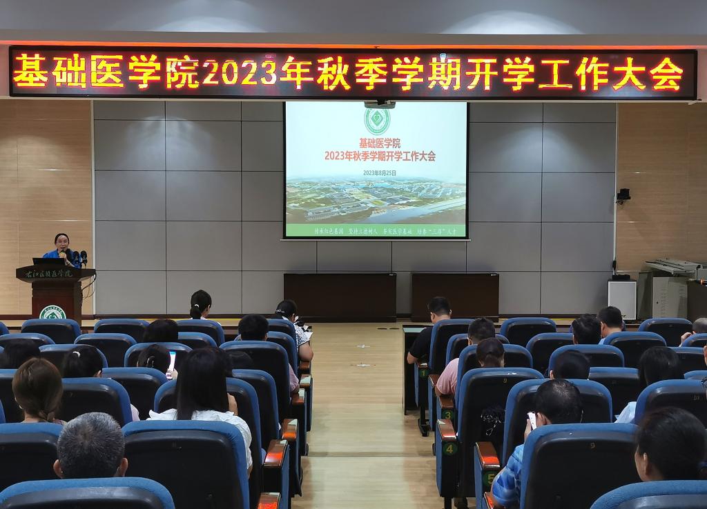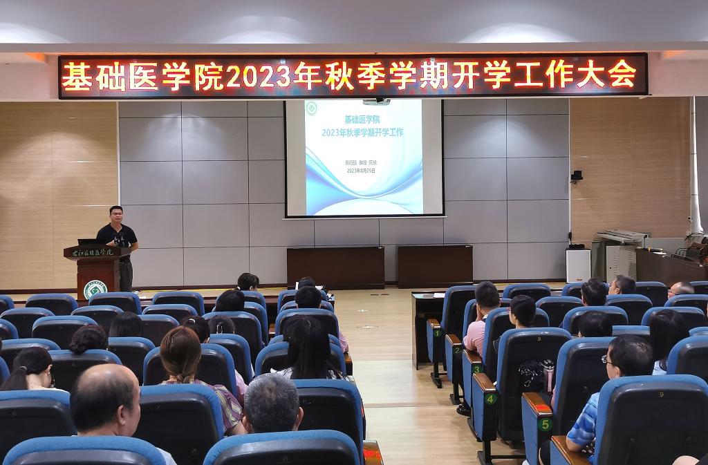 2023年8月25日上午,基础医学院于校本部5栋101学术报告厅召开2023年秋季学期开学工作大会,基础医学院全体教职工参加了会议,会议由基础医学院党委副书记卢荣妹主持。
