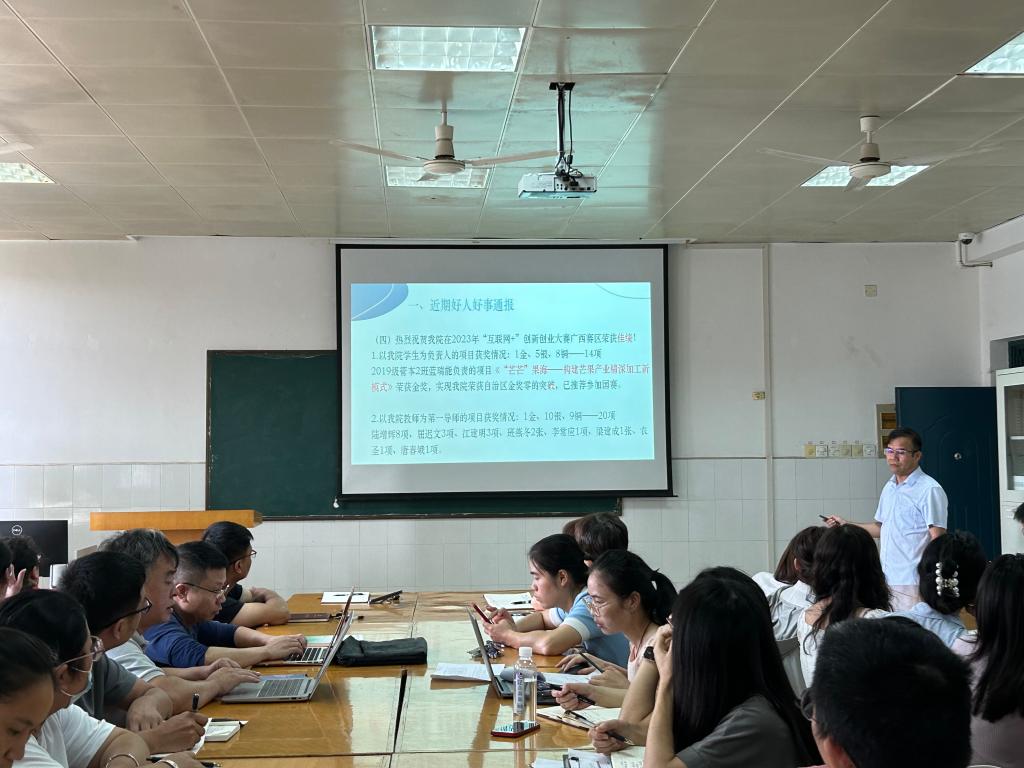 李常应书记从通报近期好人好事、暑假期间完成的主要工作、部署重要工作和开学初需完成的主要工作等四个方面进行部署。他首先祝贺该学院在参加2023年“互联网+”创新创业大赛广西赛区和2023年(第九届)全国大学生统计建模大赛广西赛区中获奖,以及通过广西一流学科公共卫生与预防医学中期评估,预防医学专业在自治区专业综合评估中荣获四星级别等取得的优异成绩。同时对暑假期间完成的主要工作进行了总结,并从主题教育与党建工作、教学工作、就业工作、学生工作、科研工作等五个方面对该学院近期的重要工作进行了部署和安排。李常应书记要求各科室、全体教职员工要做好2023届毕业生12月份的就业任务,新教师试讲,一流学科建设指标,2024届毕业生就业、考研、考公等工作。