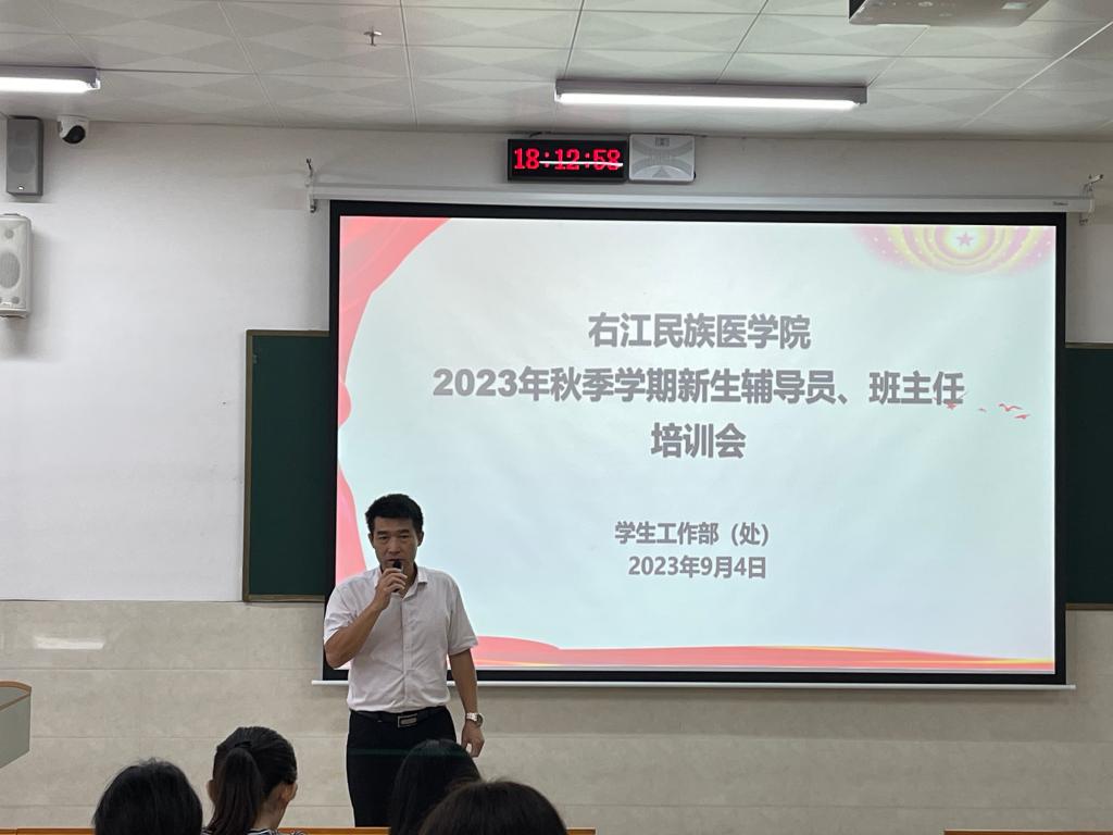 学工处副处长邱勇强从心理健康、心理排查、心理危机干预等方面,对新生辅导员、班主任如何应对学生心理健康问题进行专题培训;基础医学院党委副书记卢荣妹老师以《以生为本,润物于心,育人无形》为题,分享辅导员在学生管理工作中的好经验、好做法;教务处教务科韦俏老师解读了相关学生学籍管理、入学资格审查、保留学籍等文件条例;财务处资金结算科李宏丽老师讲解涉及到学生报道缴费的相关要求和注意事项;学工处学生资助办韦燕萍老师介绍了学生资助工作的概况,重点强调了“奖、贷、助、补、免、勤”资助体系要严格按照文件要求执行;医学影像学院学生科卢小新老师从班主任的角度,分享如何更好成为一名合格的班主任。