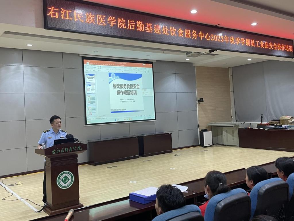 2023年9月3日晚20:00,后勤基建处邀请百色市右江区市场监管局食品餐饮监管股股长黄鹏到beat3655-101学术报告厅为饮食服务中心开展2023年秋季学期饭堂员工食品安全操作培训。后勤基建处副处长刘士铭、后勤基建处饮食服务中心主任杨列及饮食服务中心全体员工参加培训。