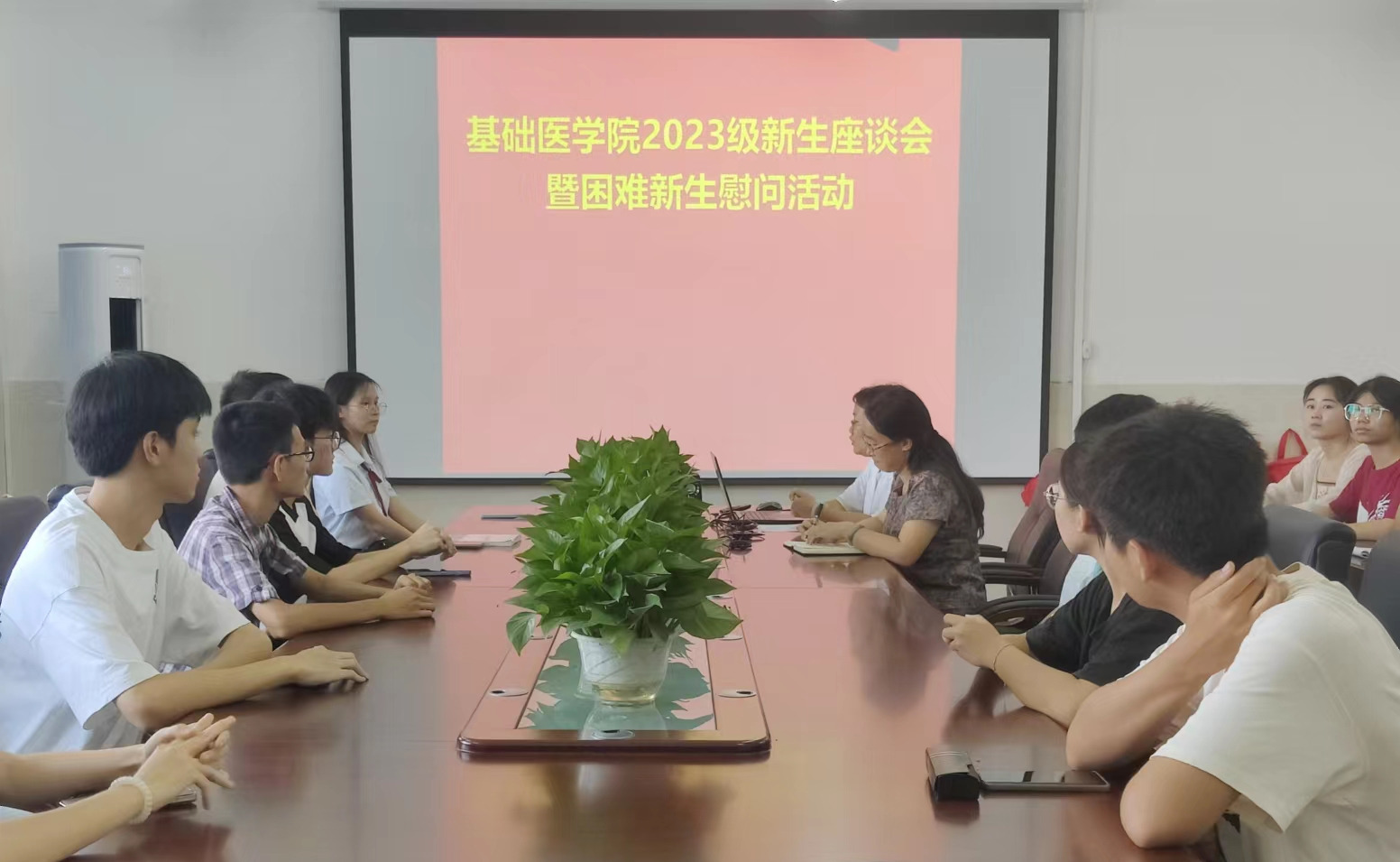 9月21日下午,基础医学院在百东校区创新楼B401会议室召开2023级新生座谈会暨困难新生慰问活动,学院党委副书记卢荣妹、学生科科长欧融及各班级新生代表参加了座谈会,座谈会由欧融老师主持。