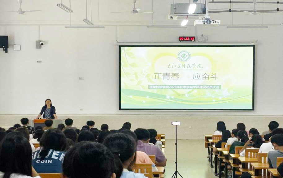 9月17日,医学检验学院在百东校区C-107、C-106举行了学风建设动员大会,旨在引导学生树立正确的学习态度,提高学习效果。本次动员大会分本、专科两个会场线上、线下同时进行。何彦妮副书记、庞雅琴副院长、韦贵将副院长、教学科何涛老师、学生科辅导员及2023级、2022级全体同学参加本次会议。