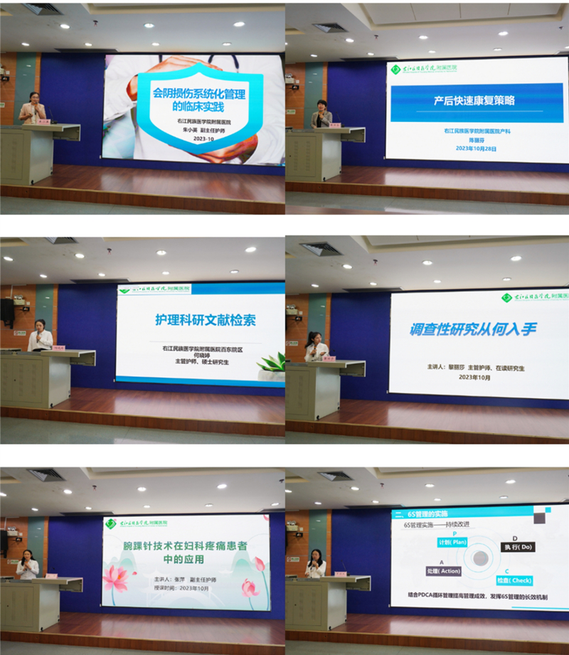 开班仪式结束后,培训班先后邀请了来自广西壮族自治区人民医院妇产科护士长张静、妇产科副护士长陈琼,广西壮族自治区妇幼保健院妇产科护士长兼厢竹产房护士长唐丽春,百色市妇幼保健院龙船院区负责人兼护理部主任李艺,百色市人民医院护理部副主任覃丽锦,右医附院大外科护士长罗琳雪,右医附院妇科二病区黄莎莎、黎丽莎、张萍,妇科一病区罗丽民、张夏露,右医附院总院区产科护士长陈丽芬,右医附院百东院区妇产科朱小英、何晓婷等14名区内专家,分别作了《妇科日间手术的开展与管理探索》、《浅谈临床护理沟通模式》、《正常分娩临床实践指南解读》、《盆底整体康复趋势》、《复盘在模拟教学中的应用》、《循证护理应用于宫颈癌根治术后尿潴留的临床实践研究》、《盆腔脏器切除术后患者的盆底康复策略》、《调查性研究从何入手》、《腕踝针技术在妇科疼痛患者中的应用》、《6S管理在妇科管理中的应用》、《妇科睡眠安心病房的构建》、《产后快速康复策略》、《会阴损伤系统化管理的临床实践》、《护理科研文献检索》的专题培训。培训期间,右医附院总院区产科护士长陈丽芬、百东院区妇产科护士长朱小英还分别应邀为培训班作了正常分娩接产技能工作坊的助产、接产技能指导演示,通过情景再现演示规范的助产接产过程。