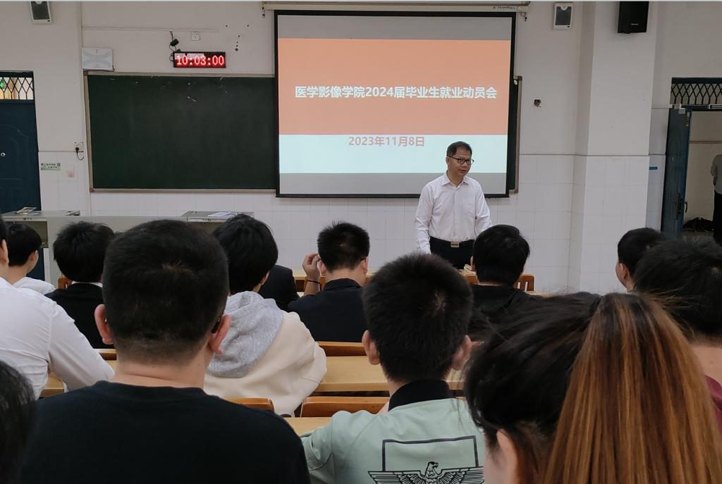 为扎实做好我院2024届毕业生就业工作,帮助毕业生更好地了解就业形势和本专业就业岗位情况,端正就业择业思想、提高就业核心竞争力。11月8日上午,医学影像学院在6栋301、6栋202分别召开2024届本科、专科毕业生就业动员大会,医学影像学院党委书记李丹、放射学教研室主任黄德尤、医学影像技术学教研室主任李保生出席会议,会议分别由学生科科长卢小新和辅导员方祥主持。