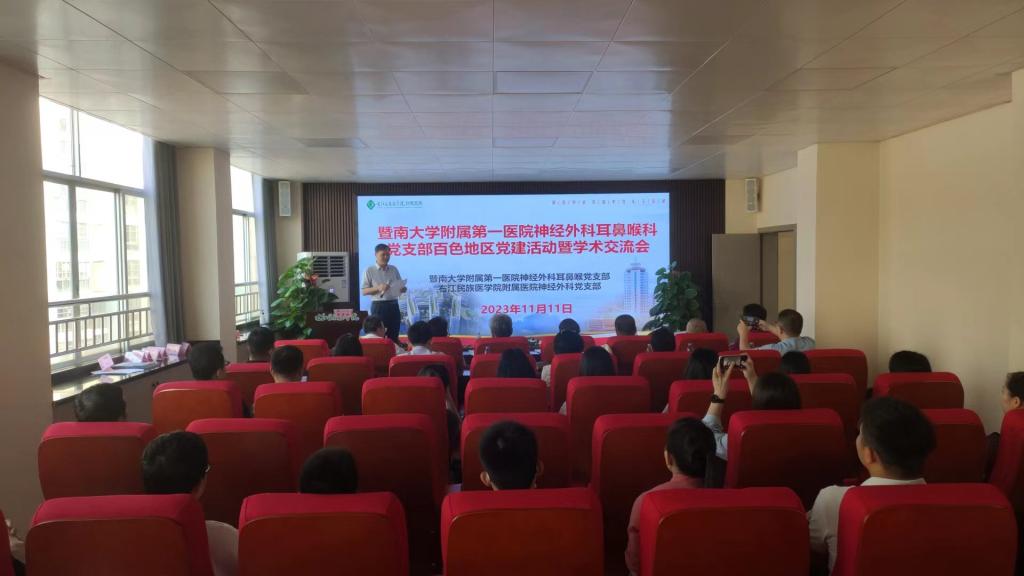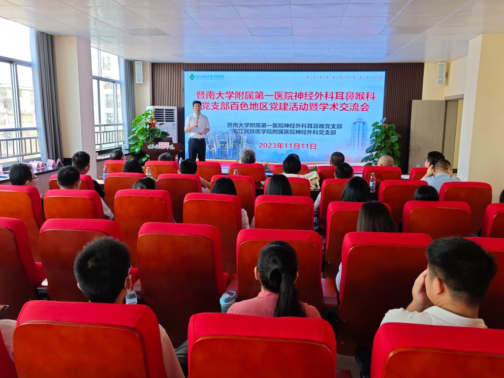 2023年11月11日,暨南大学附属第一医院脑科医院副院长、神经外科主任、中国神经外科专科医师规范化培训基地主任、国家卫生健康委能力建设和继续教育中心神经外科进修与培训基地主任王向宇教授带领该院神外耳鼻喉党支部党员专家一行19人,到我院国家卫健委神经外科建设中心开展检查指导及学术交流活动,并于当日上午在beat365英国官方网站临床实验技能中心7楼会议室召开党建学术交流会。我院副院长蓝常贡出席会议并致辞,我院神经外科党支部党员和科室全体医护人员参加会议。我院神经外科主任、国家级神经外科建设中心负责人黄海能教授主持会议。