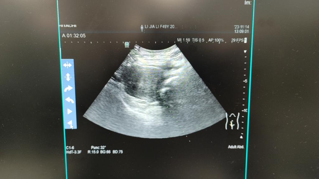 患者李某49岁,因“次全子宫切除术后8年,检查发现盆腔肿物1年,尿频及腹痛腰痛持续无好转”于2023年11月12日入院。患者8年前因子宫腺肌症行次全子宫切除术,1年前患者因尿频、腹胀已在我院检查发现盆腔肿物大小约85*79*62mm,考虑宫颈占位,当时建议行开腹手术切除肿瘤,但其因害怕术后疼痛拒绝开腹手术,直到今年患者持续尿频、腹痛、腰痛才再次到医院复诊,超声及磁共振检查提示肿瘤有所增大约94*75*76mm,考虑宫颈肌瘤可能。建议其首选开腹手术,但其仍然坚决拒绝,其诉求一是不开腹,二是不切除宫颈。我院妇科二病区梁月秀主任与患者及家属耐心沟通后,告知还有另外一个选择,就是微波消融术,患者及家属听闻该手术为微无创手术,手术精准,术后无疼痛,无疤痕,立即决定住院行宫颈病灶微波消融术。