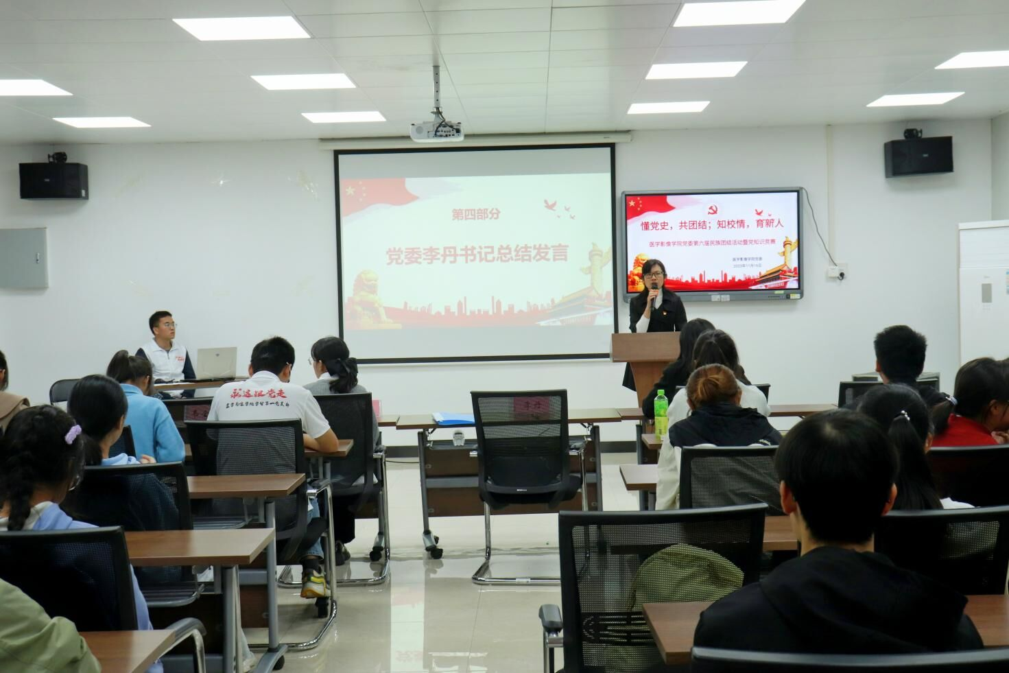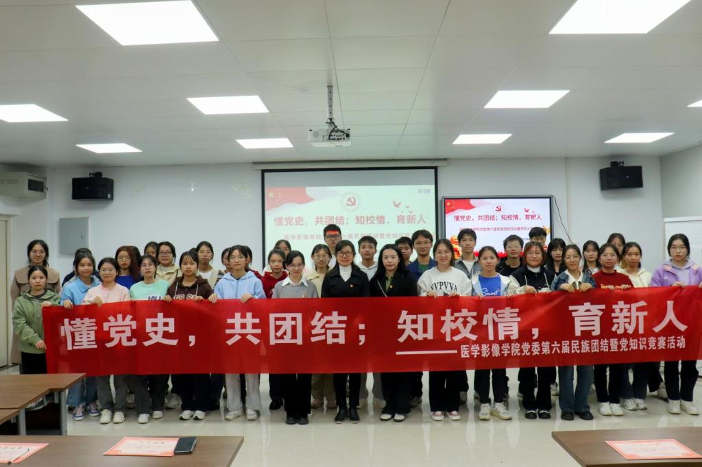 11月16日晚,医学影像学院党委在护理学院二楼多媒体教室开展以“懂党史,共团结;知校情,育新人”为主题的第六届民族团结暨党的知识竞赛活动。活动由茜雯、滕宏两名同学共同主持,医学影像学院党委李丹书记、学生第一党支部韦金凌书记、方祥老师、学生第三党支部赖倩书记共同参与。
