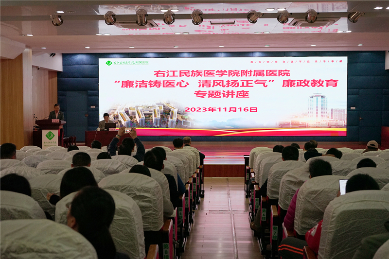 为强化医院党风廉政教育,推进纠治医疗卫生领域腐败和作风问题专项行动及清廉医院建设,2023年11月16日下午,临床医学院(附属医院)在总院区学术报告厅举办“廉洁铸医心 清风扬正气”廉政教育专题讲座。自治区卫生健康委直属机关党委副书记、机关纪委书记郑志大同志应邀到会进行专题授课,临床医学院(附属医院)领导班子成员和全院党支部书记、中层干部及党员代表、关键岗位人员等聆听讲座。临床医学院(附属医院)纪委书记梁楚晗主持讲座。